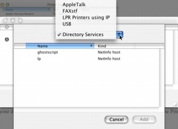 In the pop-up menu that allows you to select the class of printer (i.e., AppleTalk, USB, LPR Printers using IP, and Directory Services), select Directory Services. You should see listed the ghostscript printer. If you setup for TCP/IP printing, you’ll additionally see the printer lp. These are the printers we defined in NetInfo Manager.